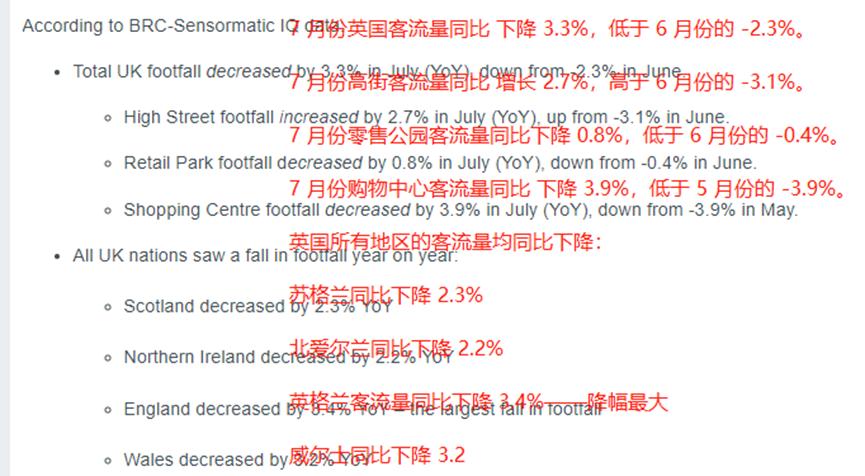 具體來看,7月,英國街道客流量同比增長了2.7%,但零售公園的客流量同比下降了0.8%,降幅大于6月份的0.4%。與此同時(shí),該月英國購物中心的客流量同比下降最為明顯,降幅達(dá)到了3.9%。而從地區(qū)來看,7月英國蘇格蘭、北愛爾蘭、英格蘭和威爾士的客流量都出現(xiàn)了下降,降幅在2.2%—3.4%不等。