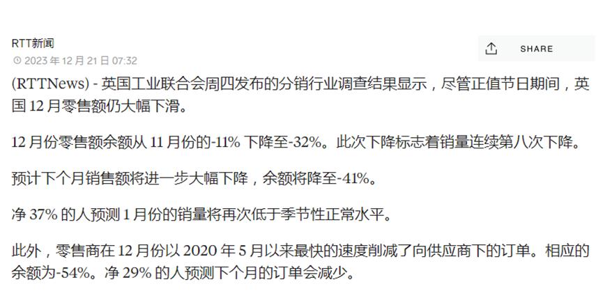 一份來自英國工業(yè)聯(lián)合會(huì)(Federation of British Industry)的調(diào)查報(bào)告顯示,去年下半年,即使是黑五、網(wǎng)一、圣誕節(jié)等一系列重量級(jí)大促,都沒能點(diǎn)燃英國消費(fèi)者的購物熱情。數(shù)據(jù)顯示,去年11月,英國零售額同比下降了11%,12月零售額繼續(xù)同比下降32%。按照這樣的趨勢(shì),今年1月英國零售額預(yù)計(jì)同比下降41%。
