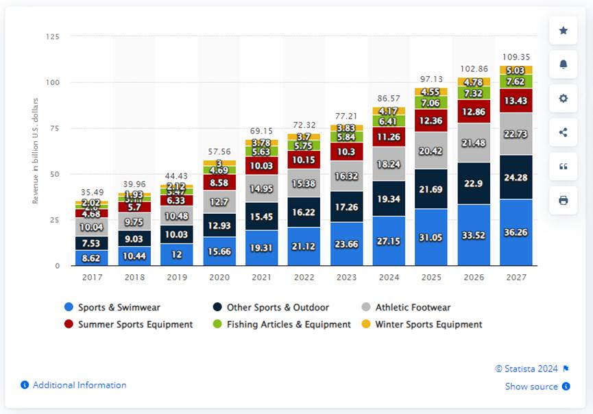 作為戶外運(yùn)動細(xì)分市場之一的水上運(yùn)動已經(jīng)釋放出持續(xù)增長的積極信號,那么就更大的市場來說,戶外運(yùn)動產(chǎn)品類目擁有著更多的商機(jī)。來自研究機(jī)構(gòu)Statista的數(shù)據(jù)表明,2024年,全球運(yùn)動及戶外電商市場預(yù)計達(dá)到865.7億美元。經(jīng)過幾年的發(fā)展,這一數(shù)字到2027年時有望飆升至1093.5億美元。
