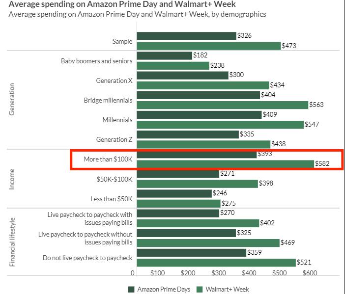 值得一提的是,盡管沃爾瑪會員周在獨有客戶比例方面與亞馬遜Prime Day持平,但在消費者支出方面,沃爾瑪會員周的平均支出要比亞馬遜Prime Day高出約45%。這種支出差距存在于各世代的消費群體中,尤其是年收入超過10萬美元的消費群體,這種支出差異最大。這意味著,在吸引高消費群體方面,沃爾瑪的表現要明顯優于亞馬遜。