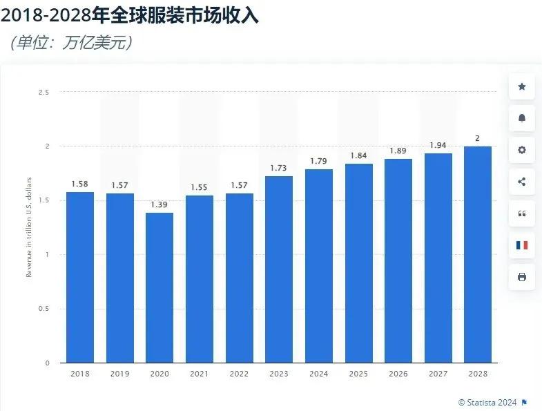 正所謂“衣食住行”,服裝作為每個人生活的必需品,其市場一直是十分龐大的,而且門款也不像消費電子產品那樣高,因此服裝也成為了很多新手賣家入局的首選之一。據Statista數據顯示,全球服裝市場收入將持續增長,預計到2028年,該市場規模將達到2萬億美元。