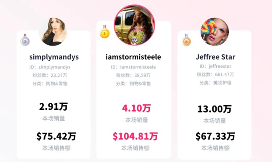 就在不久前,TikTok美區(qū)就展開(kāi)了一場(chǎng)激烈的直播爭(zhēng)霸賽。首先是知名網(wǎng)絡(luò)達(dá)人@Jeffree Star以單場(chǎng)直播銷量13萬(wàn),總銷售額66.5萬(wàn)美元的成績(jī)創(chuàng)下TikTok直播的最高記錄;緊接著@Simply Mandys又以73.7萬(wàn)美金的GMV實(shí)現(xiàn)反超;最后@iamstormisteele用驚人的104.81萬(wàn)美金直播GMV斷層領(lǐng)先,成為TikTok美區(qū)直播圈的最強(qiáng)帶貨王。