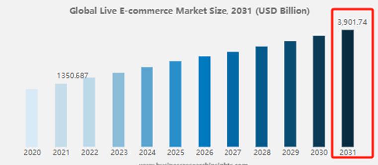 據(jù)Statista提供的數(shù)據(jù),2023年美國(guó)直播電商銷售額大約為500億美元,預(yù)計(jì)未來(lái)三年將持續(xù)增長(zhǎng)36%。而B(niǎo)usiness Research的數(shù)據(jù)則指出,到2031年全球直播電商市場(chǎng)規(guī)模預(yù)計(jì)將達(dá)到39017.4億美元,2021年-2031年復(fù)合年增長(zhǎng)率大概為11.28%。