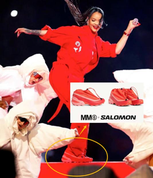2023年2月,在美國職業(yè)橄欖球大聯(lián)盟冠軍總決賽,第57屆超級碗Super Bowl的中場秀上,知名女歌手Rihanna腳踩一雙Salomon的MM6聯(lián)名款運動鞋閃亮登場,頂級賽事IP加超級明星效應(yīng)也為Saloman帶來了一波空前的熱度。
