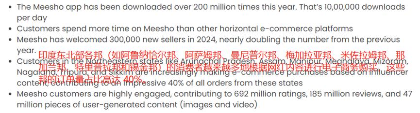 值得一提的是,在這份報告中,Meesho還指出了一些新興的消費者購物趨勢,比如社交電商。該平臺表示,在阿魯納恰爾邦、阿薩姆邦、曼尼普爾邦等印度東北部地區,消費者越發熱衷于根據社媒網紅的建議來進行電商購物,來自這些邦的訂單量也占到了平臺總訂單量的差不多40%。