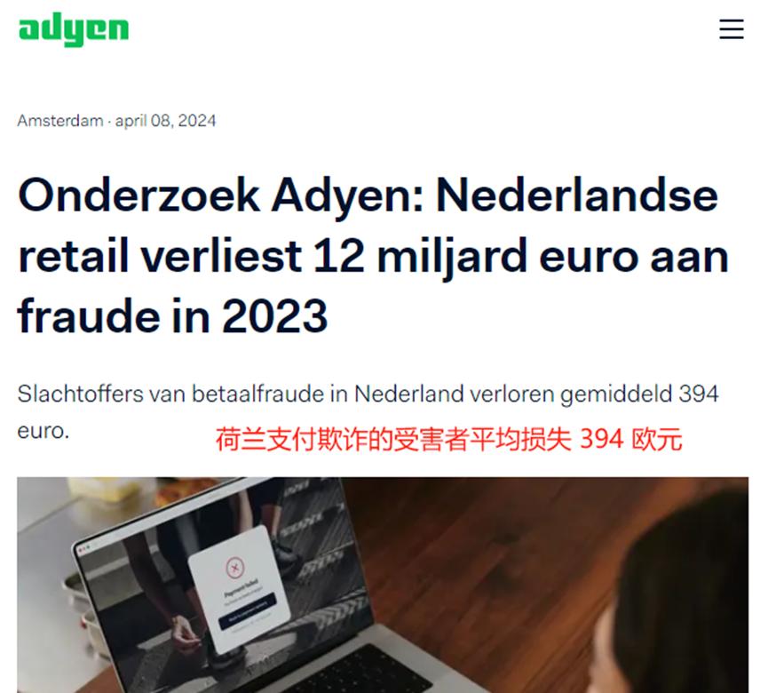 話又說回來,盡管荷蘭電商發展態勢很好,但這一市場目前確實還存在一些問題,比方說網絡詐騙。今年4月,金融技術平臺Adyen發布了一項研究報告,結果顯示,過去一年,超過四成(43%)的荷蘭消費者都曾遭受支付和身份驗證方面的網絡詐騙,人均損失394歐元。荷蘭整個零售業也因網絡詐騙而受到打擊,2023年整個行業的損失高達124億歐元。
