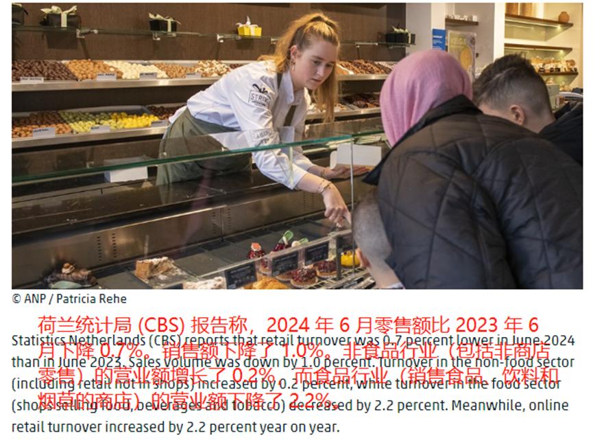 近日,據媒體報道,荷蘭統計局(CBS)公布了一份關于荷蘭零售市場的研究報告。報告數據顯示,今年6月,荷蘭零售額相較于上一年同期下降了0.7%,銷售額也同比下降了1%。從細分品類來看,食品飲料品類的營業額同比下降得較為明顯,降幅為2.2%;非食品品類的營業額則同比小幅增長了0.2%。
