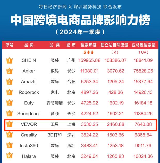 這個品牌便是暢銷全球的國產工具品牌VEVOR。就在前不久,每日經濟新聞聯合深圳易勢科技發布了2024年第一季度《中國跨境電商品牌影響力百強榜》,作為工具出海領域的頭部大賣,VEVOR以第七的排名赫然上榜,成為該榜單中工具品類僅有的三強之一,也是排名最高的工具品牌。