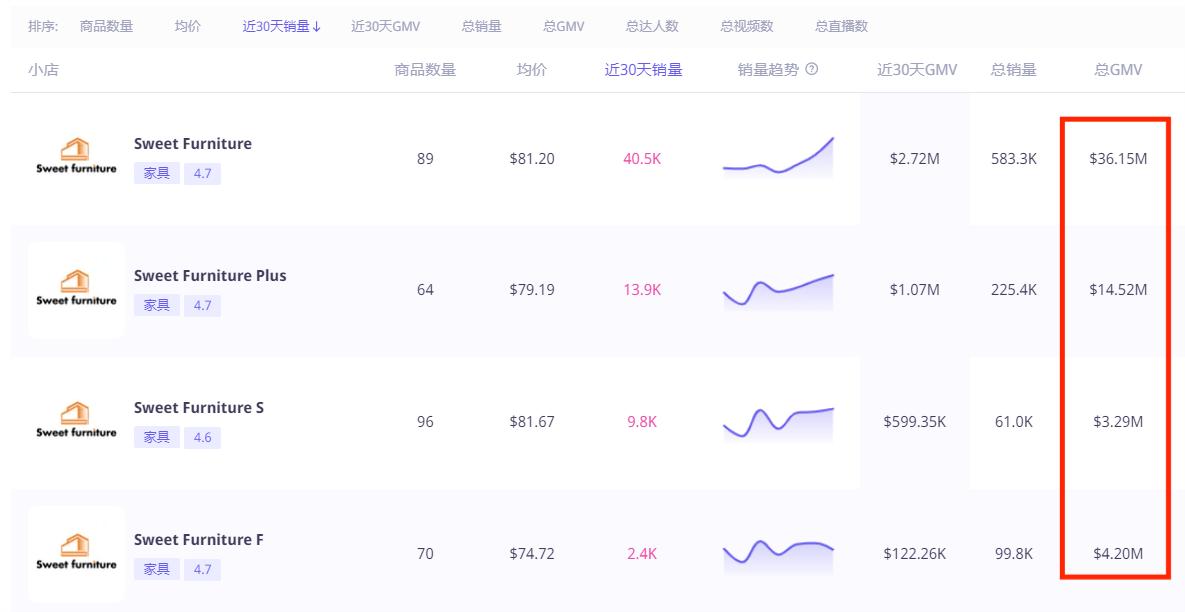 Sweet Furniture四家TikTok小店銷售業績突出 圖源:Echotik