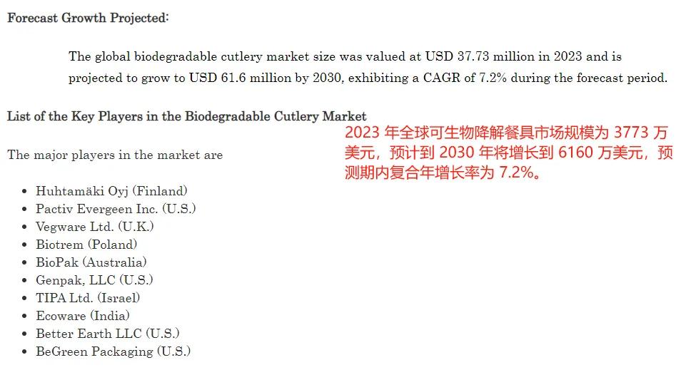 Fortune Business Insights的數(shù)據(jù)顯示,2023年全球可生物降解餐具市場(chǎng)規(guī)模為3773萬美元,預(yù)計(jì)到2030年將增長到6160萬美元,預(yù)測(cè)期內(nèi)復(fù)合年增長率為7.2%。在這個(gè)獨(dú)具一格的賽道上,主要玩家有Biotrem、Vegware Ltd、Pactiv Evergeen Inc.等。