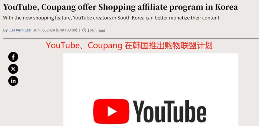 Coupang與YouTube合作推出購物聯盟計劃 圖源:kedglobal