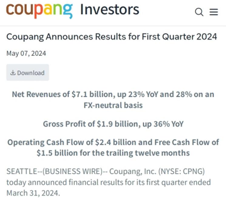 官方財報顯示,2023年第四季度,Coupang達成了10億美元的凈利潤。2023年全年,Coupang營收達到了244億美元,不僅相較上一年增長了20%,還超出了分析師的預期,同時該年度也是Coupang首個盈利年度。今年第一季度,Coupang的業績繼續增長,凈收入同比增長23%達到71億美元,且連續第7個季度實現盈利。