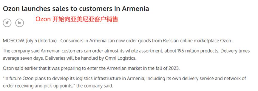 2023年7月,Ozon再下一城,宣布已經(jīng)成功進入亞美尼亞市場,對此獨聯(lián)體Ozon運營和開發(fā)總監(jiān)Alexei Sapon表示,“我們希望加強我們在該國的基礎設施,以便即使是亞美尼亞最偏遠角落的居民也可以在線訂購到想要的產(chǎn)品?!?/span>