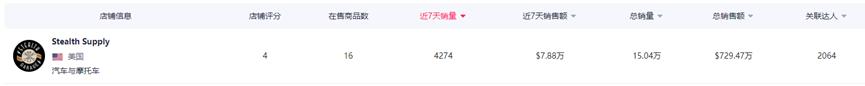 根據FastMoss提供的數據,最近一周,Stealth Supply小店的總銷量為4274件,銷售額將近8萬美元(7.88萬美元)。截止目前,該品牌在TikTok Shop總共售出了15萬件商品,總銷售額也達到了驚人的729.47萬美元。