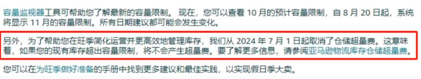 但好在賣家聽到的也并非全是壞消息。今年7月份,亞馬遜官方發布的一則新聞就顯示,為幫助賣家在繁忙的年底大促期間簡化運營并更高效地管理庫存,自2024年7月1日起,亞馬遜將取消超量倉儲費,更新后的政策適用于美國、歐盟和加拿大站點的賣家。