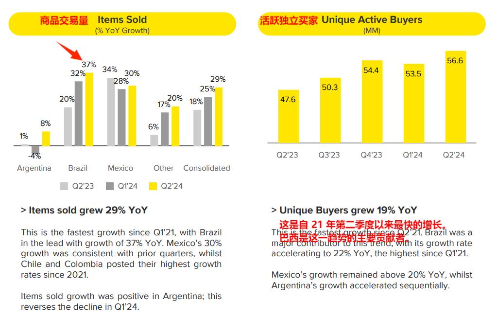在這高手云集的巴西市場,根植于拉美市場的電商巨頭美客多自然是當仁不讓的第一。根據美客多最新的財報數據,2024年第二季度,美客多商品交易總量同比大漲29%,其中,巴西市場以37%的增長比例占據領先位置。
