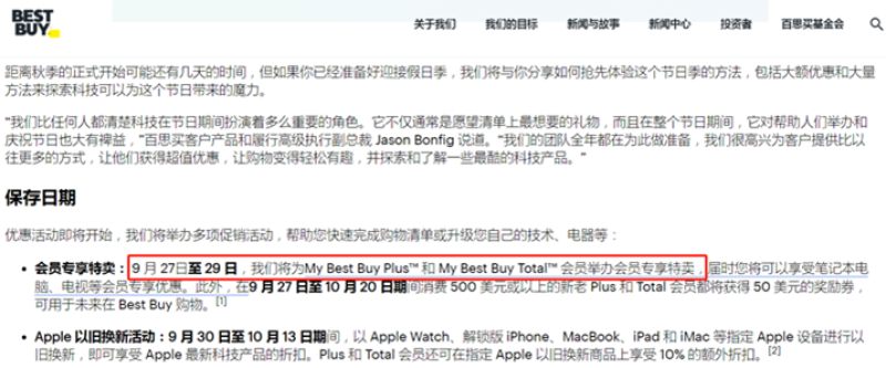 9月27日—29日,百思買率先吹響沖鋒號角,面向其“My Best Buy”忠誠度計劃的會員舉行了一場專享促銷活動,為這些消費者提供適用于多款電子產品的專屬優惠。之后,在9月30日—10月13日期間,該巨頭還舉行了Apple 以日換新活動。再之后,從10月21日起,百思買還將舉行“節日準備”大促活動。