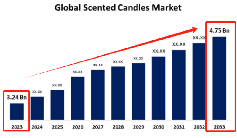 來自Spherical Insights & Consulting發布的研究報告顯示,2023年全球香薰蠟燭市場規模為32.4億美元,預計到2033年全球香薰蠟燭市場規模將達到47.5億美元。