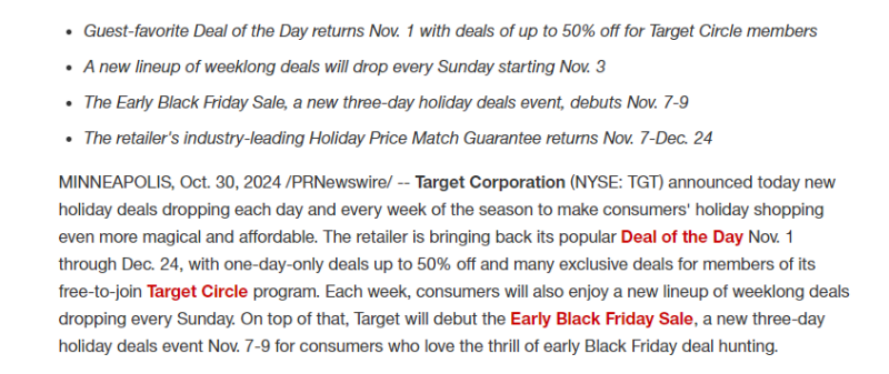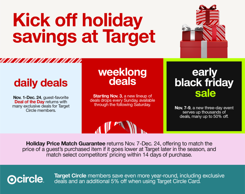 11月1日消息,塔吉特計劃于11月7日-9日推出“黑色星期五提前大促銷”,在電商網站、應用程序和門店內為全系列產品提供折扣,部分商品折扣高達50%。此外,塔吉特將于11月1日-12月24日期間恢復每日特賣活動,為免費加入Target Circle計劃的會員提供多種獨家優惠。除了每日特賣,塔吉特還將從11月3日開始,每周日推出一系列新的每周特賣,并于每周五提供預覽。