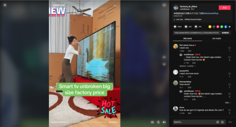 在視頻內容方面,該工廠充分展示了智能電視的賣點和性能,通過硬核測試來凸顯產品的優勢,如智能電視的輕薄、易彎曲特性,以及耐摔、耐砸和耐踩等。眾所周知,在TikTok平臺上,標簽的使用對于視頻的傳播效果至關重要。這家工廠巧妙利用了#fyp和#wholesale兩個熱門標簽,為工廠帶來了更多的潛在客戶和訂單。