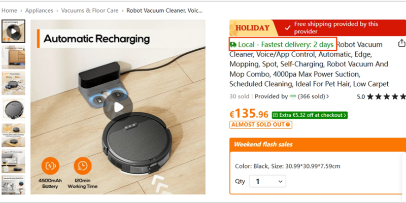 值得注意的是,Temu該允許賣家使用歐洲本土的倉庫來運(yùn)送商品和退貨,以便更好掌控物流進(jìn)程。所有從歐洲倉庫發(fā)貨的產(chǎn)品,都會(huì)在詳情頁標(biāo)上“本地-最快交付”的標(biāo)簽。通過本地交付這種物流方式,當(dāng)?shù)刭u家可以提高配送效率,在兩天內(nèi)就將商品送到消費(fèi)者手里,這種尤其有利于家具等大件商品的配送。