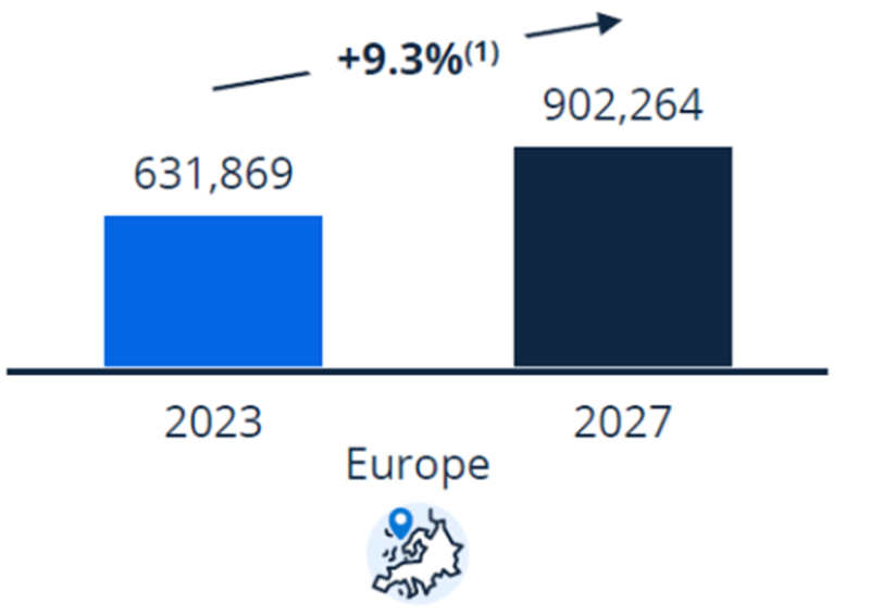 根據(jù)美國國際貿(mào)易管理局提供的數(shù)據(jù),歐洲零售電商市場(chǎng)的規(guī)模在2023年達(dá)到了6319 億美元。未來幾年,這一市場(chǎng)還將持續(xù)增長(zhǎng),預(yù)計(jì)復(fù)合年增長(zhǎng)率為9.31%,到2027年時(shí),這一市場(chǎng)的銷售總額有望達(dá)到驚人的9023 億美元。屆時(shí),歐洲的電商消費(fèi)者和電商用戶滲透率都將達(dá)到一個(gè)新高峰。