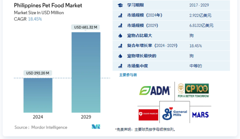 菲律賓就掀起了一股寵物經濟熱潮。數據顯示,該國寵物用品市場的規模在去年達到了60億比索(約合1.08億美元),復合年增長率峰值高達19.6%。而一份來自Mordor Intelligence的數據顯示,2024年菲律賓寵物食品市場規模達到了2.922 億美元,并且未來幾年會以18.45%的復合增長率不斷擴大,預計將在2029年達到6.8132億美元。