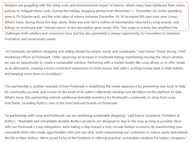 此次合作正值零售退貨激增之際。Loop數據顯示,2024年12月26日-30日的退貨總價值同比增長了8%。僅在這五天里,就有超過6760萬美元的商品退回Loop,Poshmark上描述為“錯過退貨”的商品增加了近50%。