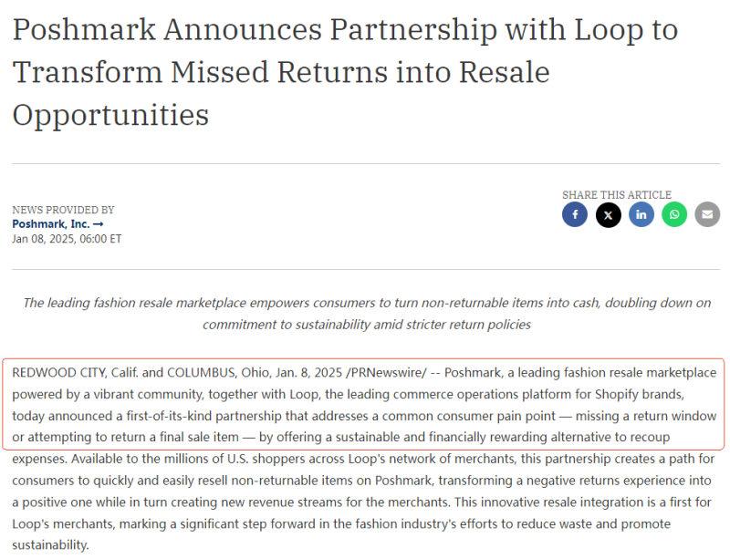 這一合作覆蓋了Loop商家網絡中的數百萬美國購物者,為他們在Poshmark上快速輕松地轉售不可退貨商品開辟了一條途徑。不僅消費者能將無法退貨的商品轉化為收入,將負面的退貨體驗轉變為正面體驗,商家也能借此降低退貨相關成本。