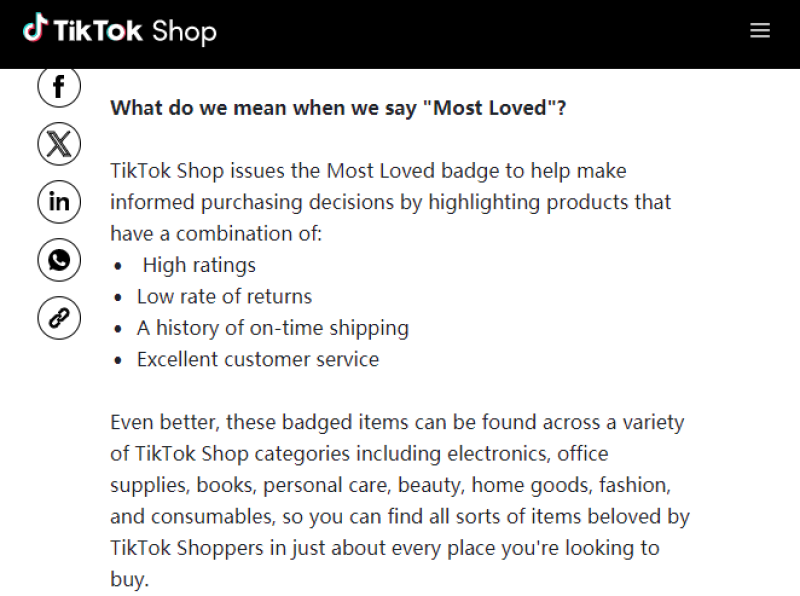 目前,TikTok已將“Most Loved”標簽應用于多個品類商品,包括電子產品、辦公用品、書籍、個人護理、時尚、美容、家居用品和日用消費品等。該標簽不僅有助于消費者找到更具可信度的產品,還能推動平臺內的銷售增長。