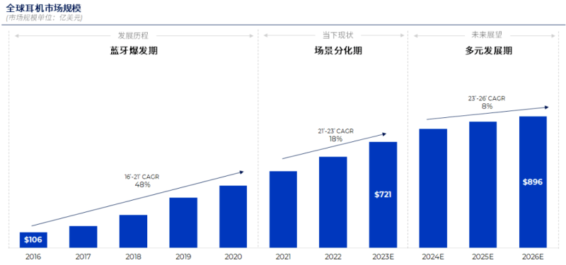 近幾年來,全球耳機市場發展越來越好,據Statista數據顯示,全球耳機市場將以8%的年復合增長率上漲,到2026年市場規模達到896億美元。