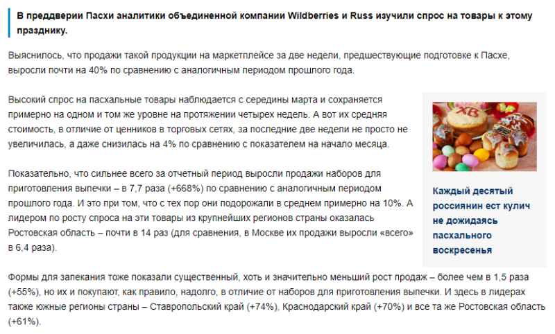 4月24日消息,Wildberries數(shù)據(jù)顯示,復(fù)活節(jié)前兩周,平臺(tái)相關(guān)商品銷量同比增長近40%,顯示消費(fèi)者對(duì)節(jié)日商品的強(qiáng)勁需求。自3月中旬起,復(fù)活節(jié)相關(guān)商品的銷售持續(xù)保持在高位,并在隨后的四周內(nèi)維持穩(wěn)定水平。盡管需求上升,整體價(jià)格趨勢(shì)卻呈現(xiàn)下降,數(shù)據(jù)顯示,該類商品的平均價(jià)格較月初下降了約4%,與多數(shù)零售渠道價(jià)格上漲形成鮮明對(duì)比。