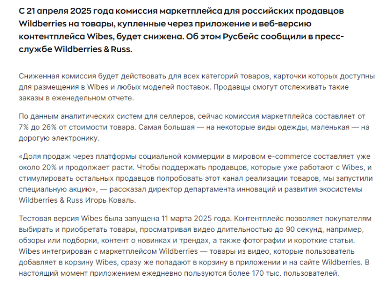 4月25日消息,Wildberries宣布自4月21日起,通過旗下社交電商應用Wibes銷售商品的部分賣家已可享受最多1%的傭金下調優惠。此次調整適用于所有可在Wibes平臺發布內容并支持任意交付模式的產品類別,旨在支持Wibes平臺的推廣與發展。