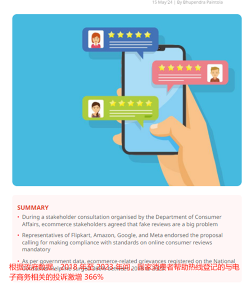 印度消費者事務部就指出,近年來,印度線上消費者的利益問題越發嚴峻,2018年時,國家消費者幫助熱線(NCH)上登記的與電子商務相關的投訴還不到10萬起,然而,隨著市場快速發展,這一數字在五年時間內激增366%,達到2023年44.4萬起,占全部投訴總量的43%。
