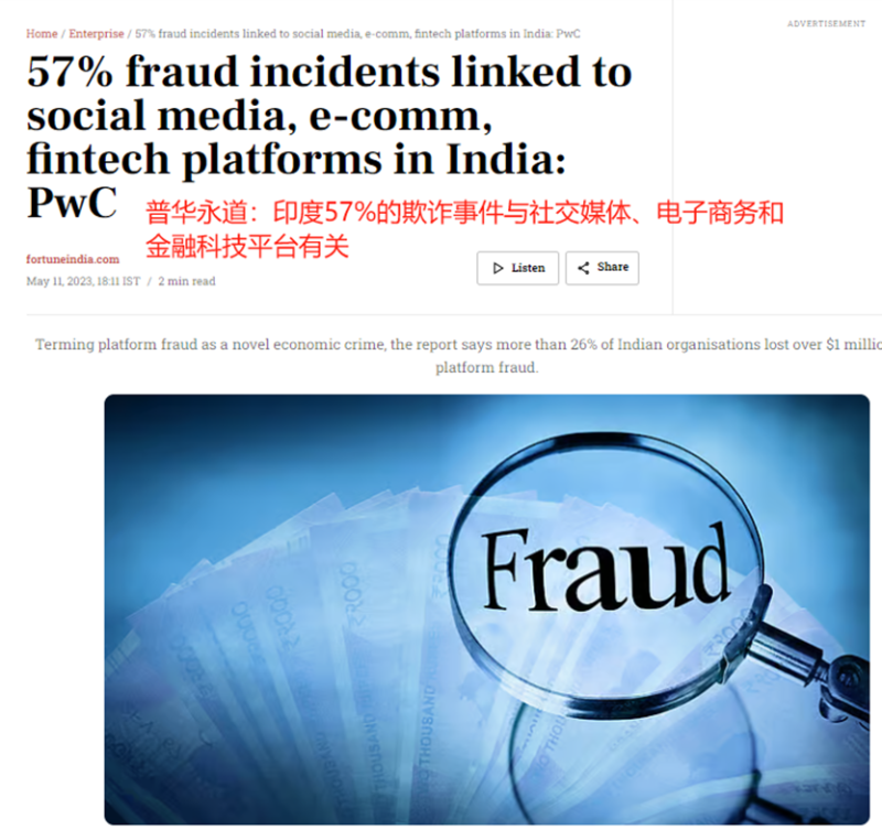 普華永道印度公司一項調查研究結果顯示,隨著互聯網的快速發展,印度社交媒體、電商平臺、企業和金融科技平臺上詐騙活動激增,約有57%的欺詐事件是在這些線上平臺上發生或者與之有關。