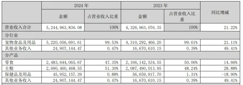 作為一家專注于寵物食品研發、生產和銷售的大賣,寵物食品自然成為其業務生命線。財報顯示,寵物食品及用品營收達到52.2億元,同比增長21.11%,占總營收的比重高達99.53%;其他業務收入僅占0.47%。從細分產品收入來看,主糧>零食>保健品及用品>其他業務收入。