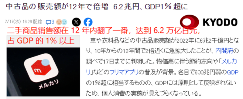 在日本,根據日本內閣府發布的調查,2010-2022年期間,日本二手商品的銷售額翻了一番,達到驚人的6.2萬億日元(約合人民幣2877億元),占GDP的1%以上。其中二手車是銷售額占比最大的,金額達到3.31萬億日元;其次是服裝配飾(5100億日元)。