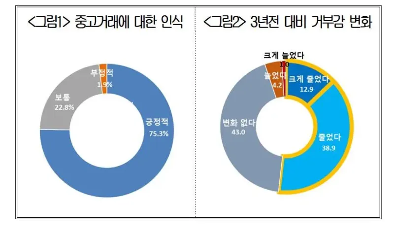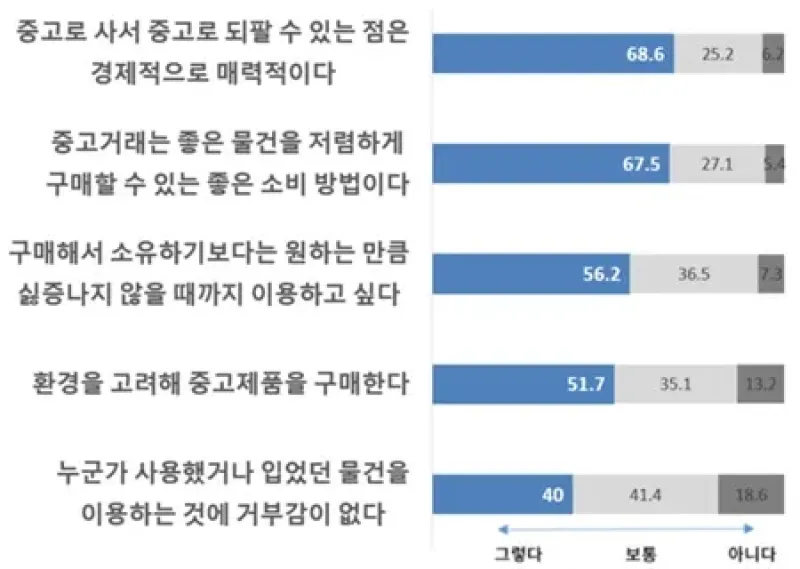 韓國商工會議所發布的《二手產品使用情況調查及循環流通事業模式創新報告》顯示,在對韓國1000名過去一年內有過二手交易經歷的20至50歲消費者調查中,有75.3%的受訪者對二手商品交易持積極態度,22.8%的人持中立態度,僅有1.9%的人回答“否”。