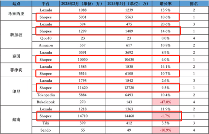 Similarweb的數(shù)據(jù)就指出,2025年3月份,印尼、越南、新加坡、泰國、馬來西亞、菲律賓這東南亞六大主要電商市場(chǎng)中,當(dāng)月訪問量(桌面+移動(dòng)端)最多的電商平臺(tái)都是Shopee,并且訪問量基本都是第二名的3-10倍,龍頭地位穩(wěn)固。