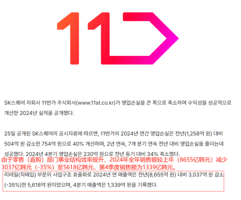 值得一提的是,今年2月底,11Street發(fā)布了其2024年第四季度以及2024年財年的財務(wù)報告,綜合兩份報告的相關(guān)數(shù)據(jù),過去一年,11Street在韓國市場的表現(xiàn)喜憂參半。2024年,11Street實現(xiàn)全年銷售額5618億韓元,比上年下降了35%;而Q4銷售額為1339億韓元,同比也是出現(xiàn)下滑。