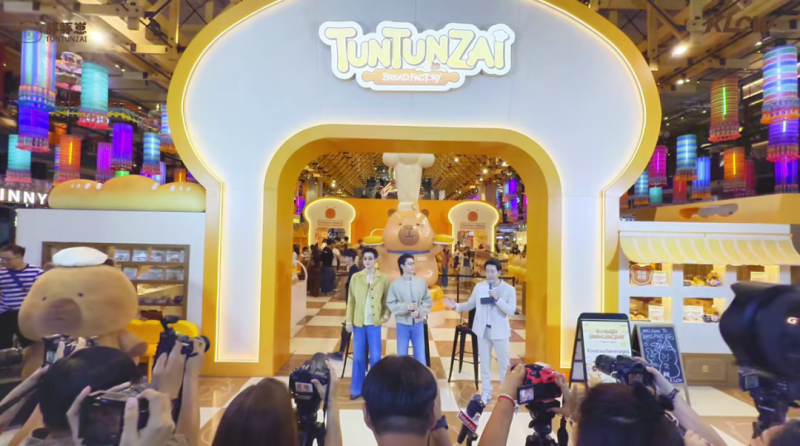 除了泡泡瑪特,還有很多可以講的品牌故事。以酷樂潮玩的原創(chuàng)IP“豚豚崽”為例,它同樣在海外市場掀起了一場購買狂潮。2025年4月,“豚豚崽”全球化戰(zhàn)略首站落地曼谷emsphere商場。開業(yè)當(dāng)天,泰國當(dāng)紅流量CP NEW & PJ作為特邀嘉賓空降現(xiàn)場,吸引了國內(nèi)外上百位網(wǎng)紅達(dá)人前往探店,社交話題熱度達(dá)千萬級。快閃開業(yè)即火爆,開展不到3天,銷售額破200萬泰銖,客流超5萬。