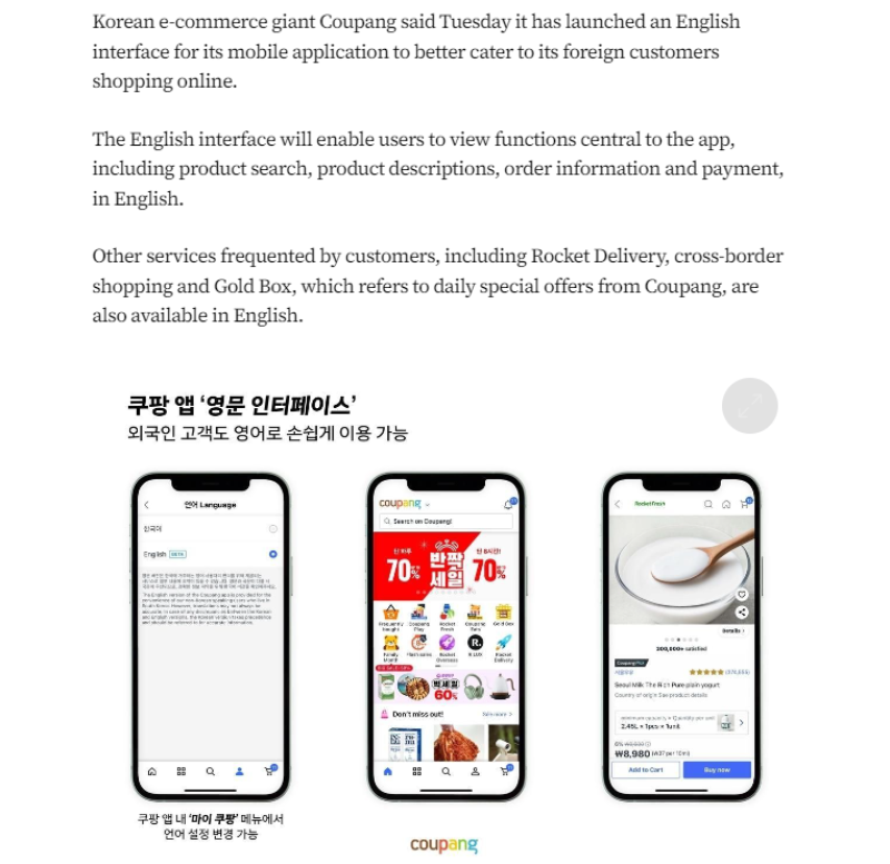 用戶可通過在應用中進入“我的Coupang”菜單手動更改語言設置來啟用英文界面。Coupang表示,近期使用英文進行商品搜索的用戶數量持續上升,推出英文界面將進一步優化外國用戶的整體購物流程。
