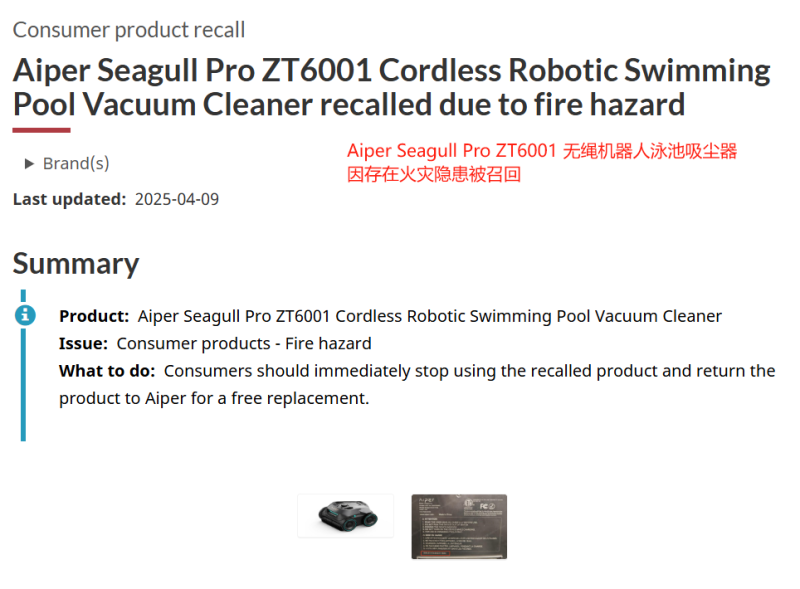比如前段時間,泳池清潔品牌Aiper旗下一款無線泳池清潔機器人Seagull Pro ZT6001被CPSC發布召回通知,原因是這款產品配備的電流適配器存在加載過熱風險,而且在宣布召回前,已經有19起報告稱這款清潔器在充電時出現冒煙甚至起火的情況。