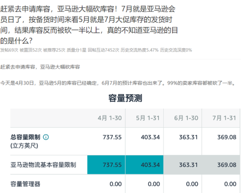 “7月就是亞馬遜會(huì)員日了,按備貨時(shí)間來看5月就是7月大促庫存的發(fā)貨時(shí)間,結(jié)果庫容反而被砍一半以上,真的不知道亞馬遜在干什么。”