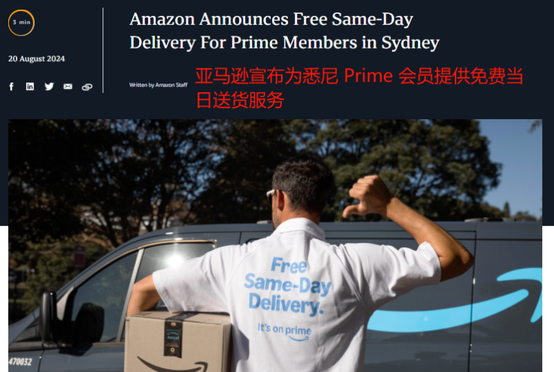 去年8月,亞馬遜宣布為悉尼Prime會員提供免費當日達服務(wù),這也是澳大利亞首個享受免費當日達服務(wù)的城市。同樣訂單需滿49澳元,商品帶有標識,不過悉尼的產(chǎn)品更豐富,符合條件的商品數(shù)超過一百萬種,覆蓋悉尼90%以上的人口。