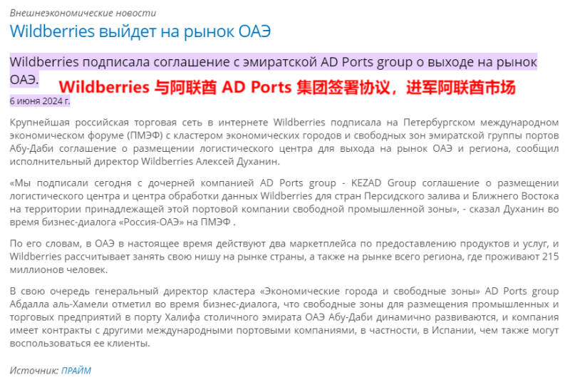 除此外,Wildberries還提前建好了物流中心。去年上半年,Wildberries就透露,已經與阿聯酋港口集團阿布扎比(AD Ports Group)簽署了一項協議,將在阿聯酋自由貿易區內開設一家物流中心和Wildberries數據處理中心,用于運營阿聯酋業務。