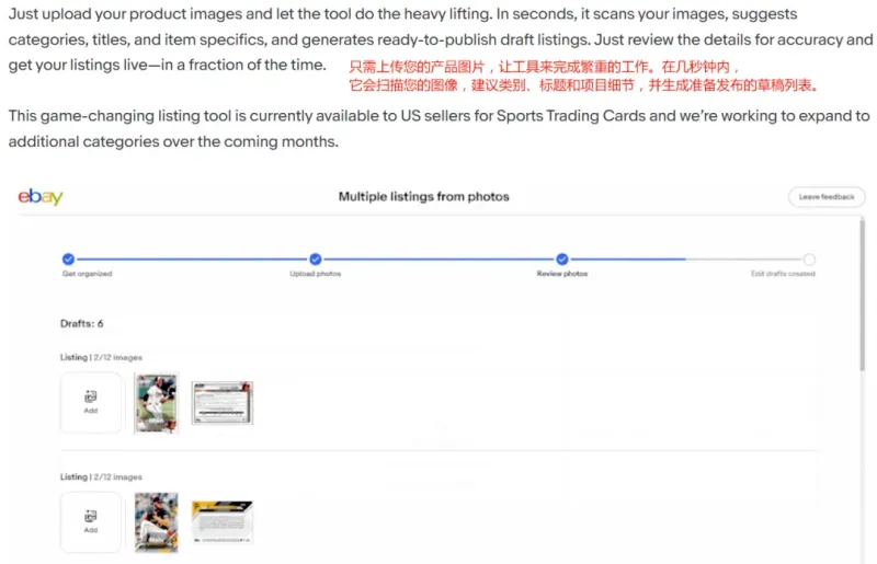 另一大巨頭eBay也不甘落后,去年10月,其推出一項名為“Magical Bulk Listing”的全新AI工具,該工具可以幫助賣家在幾秒鐘內快速生成包含類別、標題及商品細節在內的產品圖片草稿列表,以此優化賣家體驗、提升運營效率。