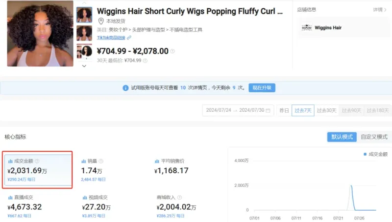 在TikTok美區(qū),Wiggins Hair頻頻登上類目銷量榜前列。Kalodata的數(shù)據(jù)顯示,此前Wiggins Hair一周拿下2000萬(wàn)美元的銷售額,日均成交金額達(dá)到290萬(wàn)美元,這使其成功登頂美區(qū)周銷量榜首。