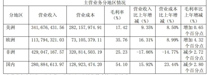 年報(bào)顯示,在2024年,非洲貢獻(xiàn)營(yíng)收最大,達(dá)到4.29億元;其次是美洲(3.42億元)、歐洲(1.14億元)。不過(guò)非洲多國(guó)貨幣劇烈波動(dòng),導(dǎo)致部分國(guó)家物價(jià)上漲、通貨膨脹,消費(fèi)者購(gòu)買力降低,出現(xiàn)消費(fèi)降級(jí);美洲和歐洲市場(chǎng)需求低迷、市場(chǎng)競(jìng)爭(zhēng)環(huán)境內(nèi)卷加劇。