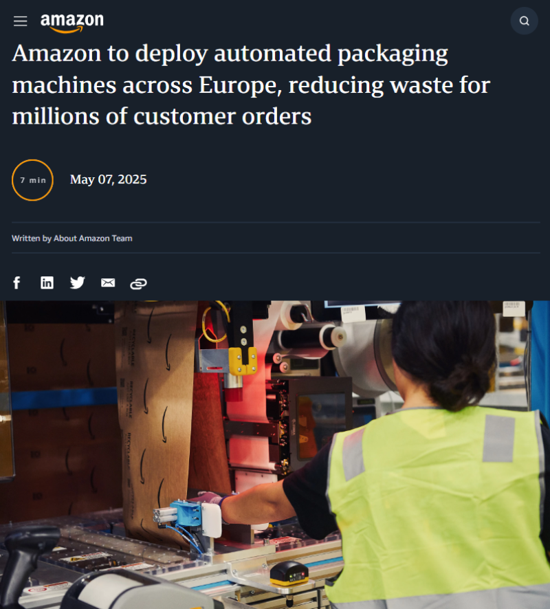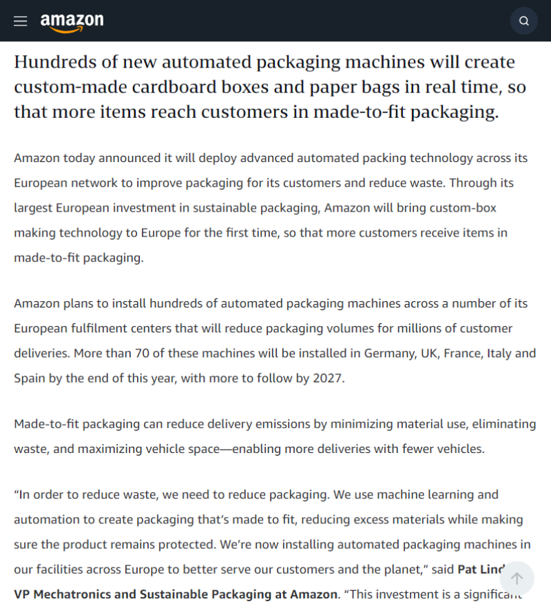 5月10日消息,亞馬遜宣布將在其歐洲物流網(wǎng)絡(luò)廣泛部署先進的自動化包裝技術(shù),以改善客戶包裝體驗并減少浪費。作為其在歐洲對可持續(xù)包裝領(lǐng)域最大規(guī)模的投資,亞馬遜首次將“定制化紙箱制作”技術(shù)引入歐洲,這些設(shè)備可以根據(jù)商品尺寸即時制作適配的紙箱和紙袋,從而減少不必要的填充材料,優(yōu)化運輸空間,降低碳排放,提高配送效率。